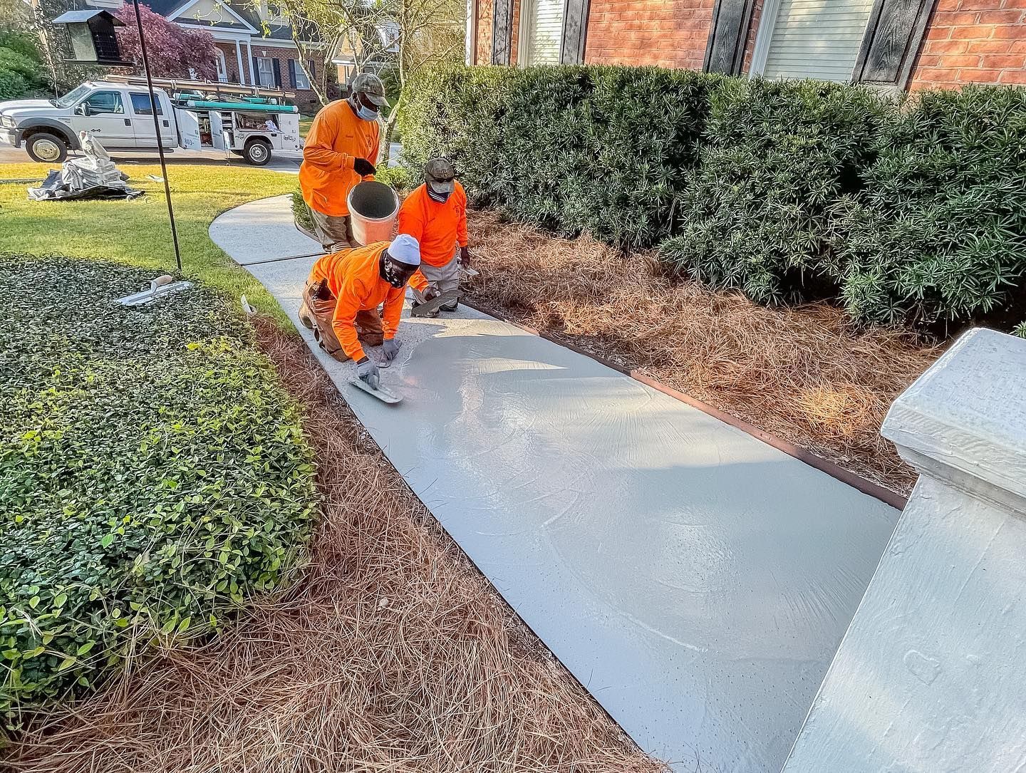 We build walkways to local standards — width, slope, and joint spacing that meet code requirements. Thickness is determined by expected traffic and whether the walkway will need to support occasional vehicle crossings, like lawn equipment or service trucks. Wire mesh or fiber additives can be included to reduce surface cracking. Walkways are typically poured in sections so that if a single panel ever needs attention down the road, it can be addressed without tearing up the whole path.